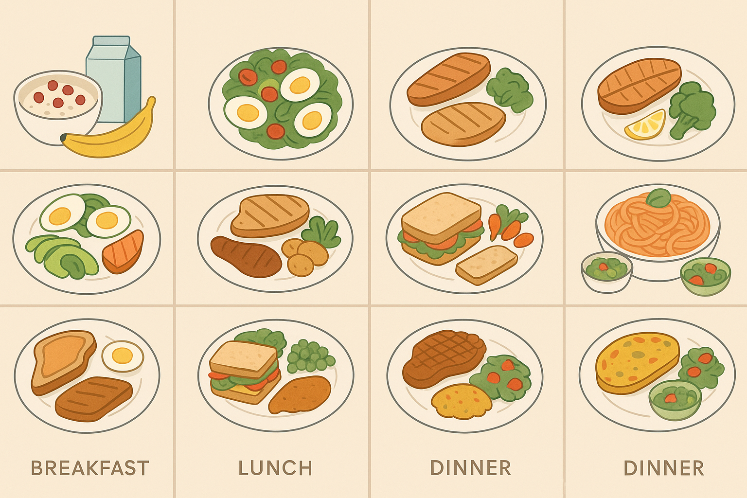| 화요일 | 통밀 토스트 + 삶은 달걀 + 토마토 | 현미밥 + 닭가슴살 샐러드 + 브로콜리 | 콩비지찌개 + 양배추찜 + 오렌지 |